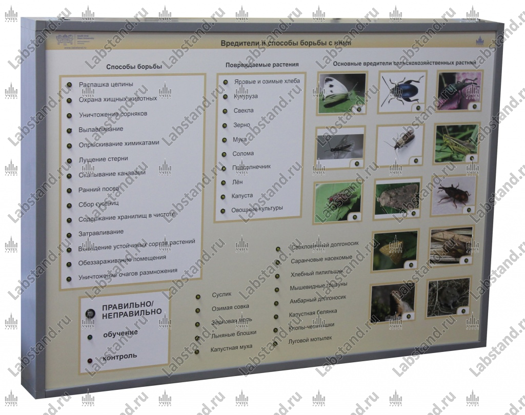 Назначение: Стенд-планшет предназначен для изучения основных вредителей сельскохозяйственных растений, причин и методов борьбы с вредителями.