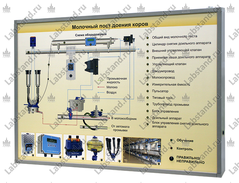 Назначение: Стенд-планшет предназначен для изучения конструкции приборов и узлов, принципов их действия в составе молочного поста доения коров в учебном курсе «Механизация животноводства».