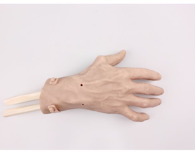 Фантом ладони и запястья взрослого пациента выполнен в натуральную величину с детальной точностью. Фантом имитирует руку пожилого пациента.
