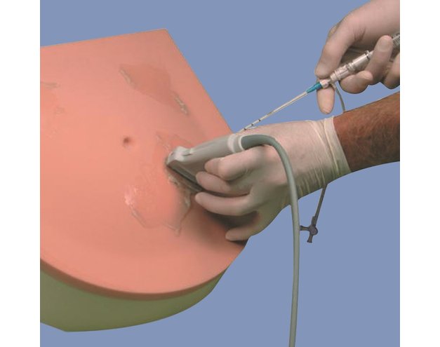 Фантом представляет собой нижнюю часть торса с анатомическими ориентирами (поверхностные эпигастральные сосуды, часть печени, часть селезенки, прямые мышцы брюшного пресса, тонкий кишечник) Удаление жидкости можно выполнять в двух точках — срединная линия ниже пупка или медиальная линия, на 4-5 см выше верхнепередней подвздошной кости.