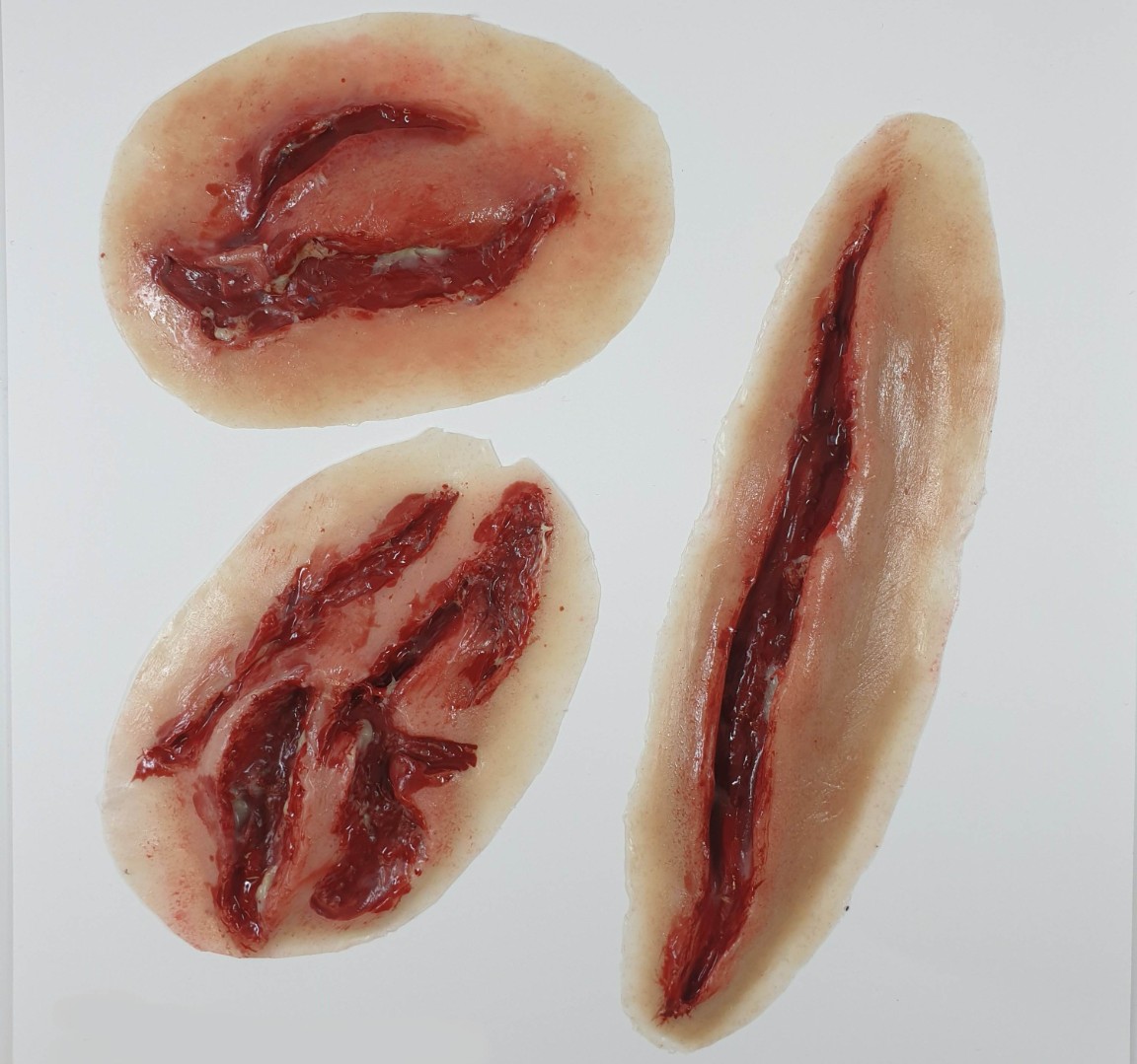- Муляжи изготовлены из прочного высококачественного силикона и приклеиваются к коже симулированного пациента или манекена без использования дополнительных средств (для более надежной фиксации можно использовать клей на основе желатина)