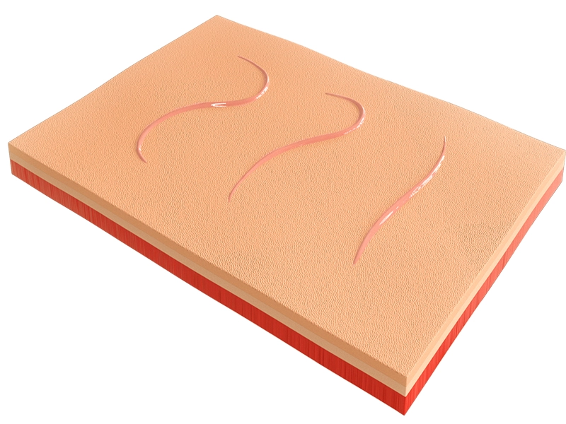 Комплект расходных материалов предназначен для отработки навыков снятия хирургических швов на тренажере снятия хирургических швов. Модель, раны с наложенным узловым хирургическим швом, изготовлена из силикона визуально и пальпаторно имитирующего ткани человеческого тела.