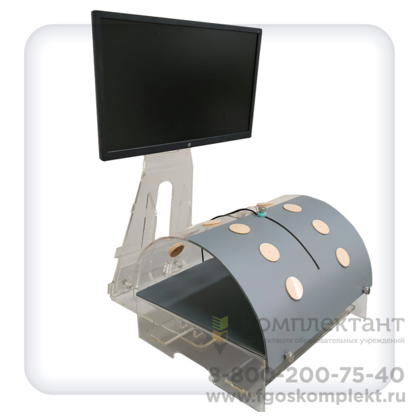 Стойка для монитора и коммутационного блока снабжена кронштейном, позволяющим изменять высоту, угол поворота и наклона экрана монитора, а также снабжена портами для подключения цифровой камеры высокого разрешения и коммутационного блока.