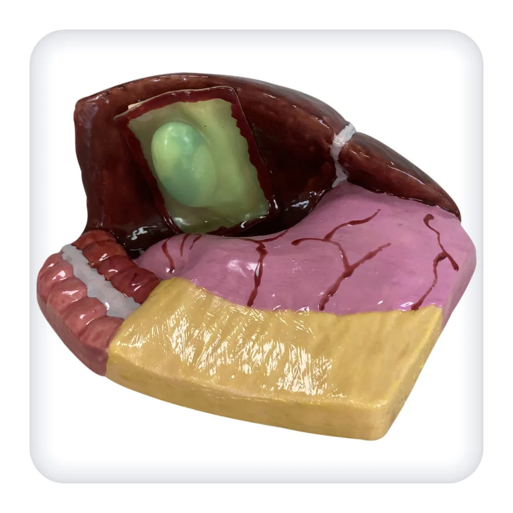 Модель представляет собой органокомплекс, включающий печень с желчным пузырем, желудок и поперечную ободочную кишку. Подробно воспроизведена анатомия желчного пузыря с участком пузырного протока и пузырной артерии, для полной отработки всех этапов лапароскопической холецистэктомии. Материал модели обеспечивает реальные ощущения при пальпации органов и осуществлении хирургических манипуляций.