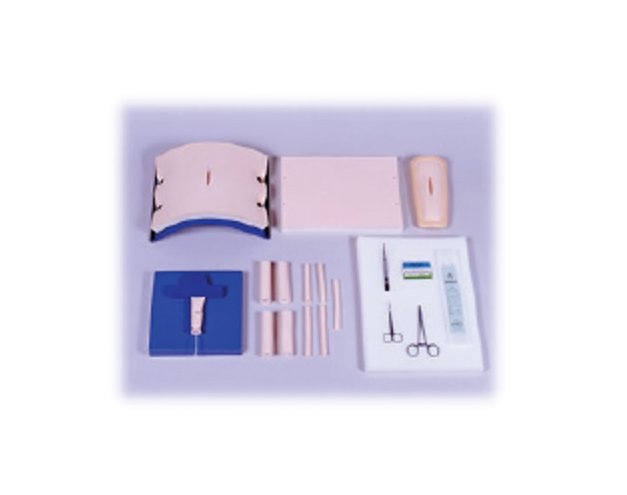 В набор входят муляжи тканей и фиксаторы: муляж кожи абдоминальной области (2 шт.) и фиксатор к нему, муляж кровеносного сосуда (5 шт.), муляж кишки (5 шт.) и фиксатор, муляж кожи области руки (2 шт.) и фиксатор к нему, а также комплект инструментов для наложения швов. Фиксаторы создают нужное натяжение ткани и имитируют изгибы. На муляжах тканей можно создавать дополнительные разрезы любой формы для последующего наложения швов.