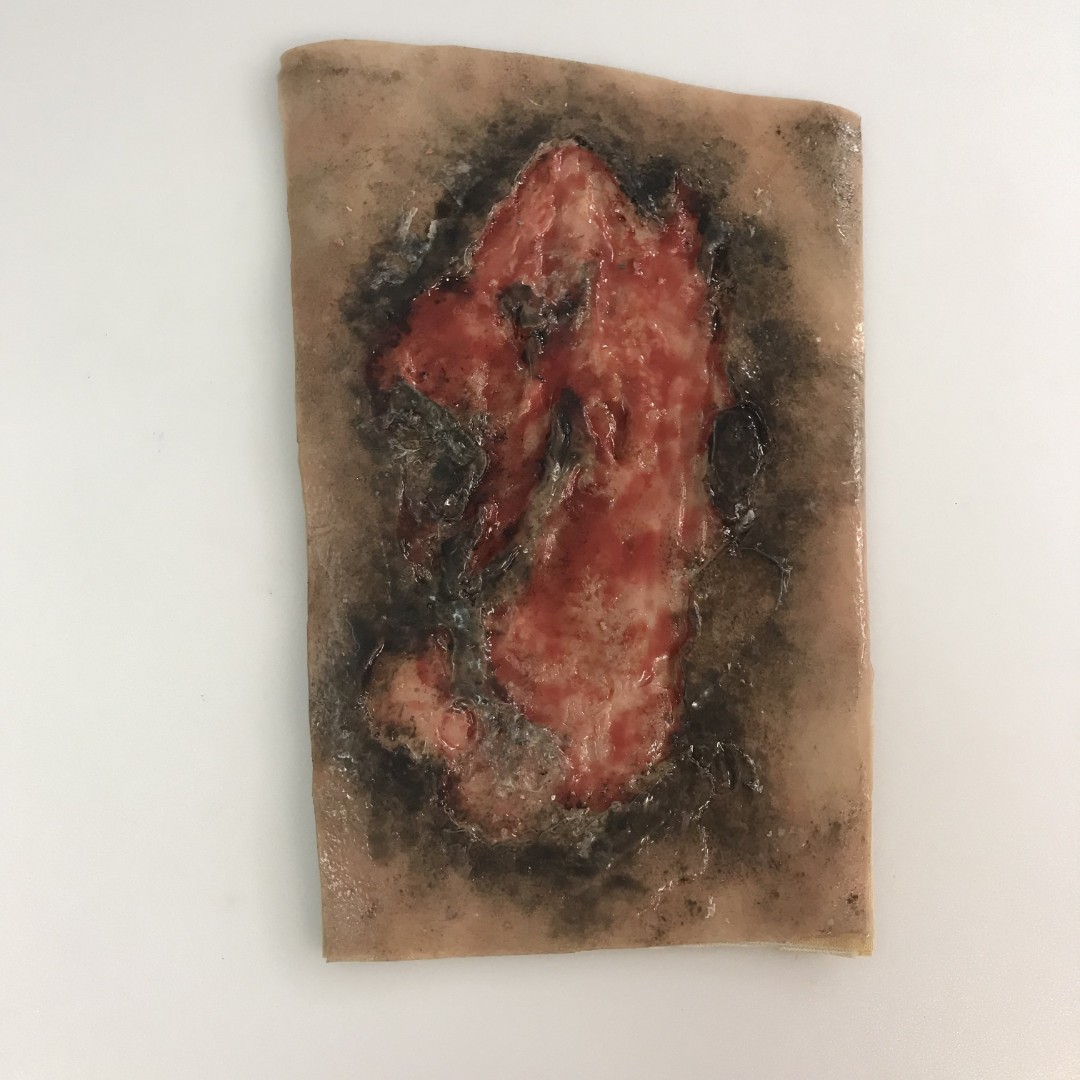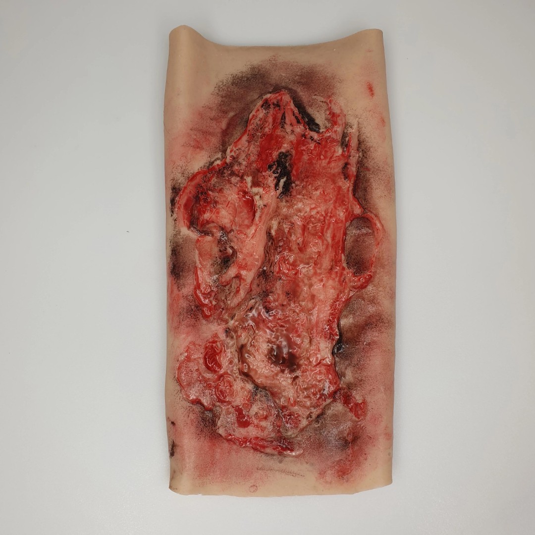 - Данный муляж воспроизводит внешний вид участка кожи руки или ноги с термическим ожогом большой площади