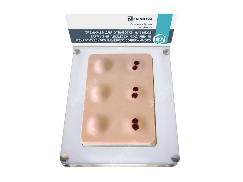 Тренажер состоит из платформы с установленным на ней модулем для отработки навыков вскрытия абсцесса и удаления некротического раневого содержимого. Тренажер дает возможность отрабатывать следующие навыки: