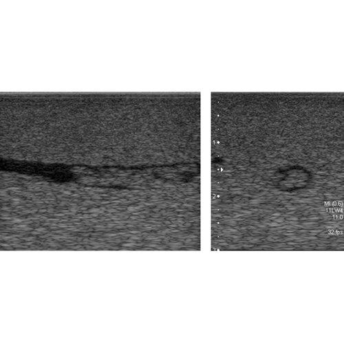 - При надавливании УЗ-датчиком происходит сжимание вен нижней конечности