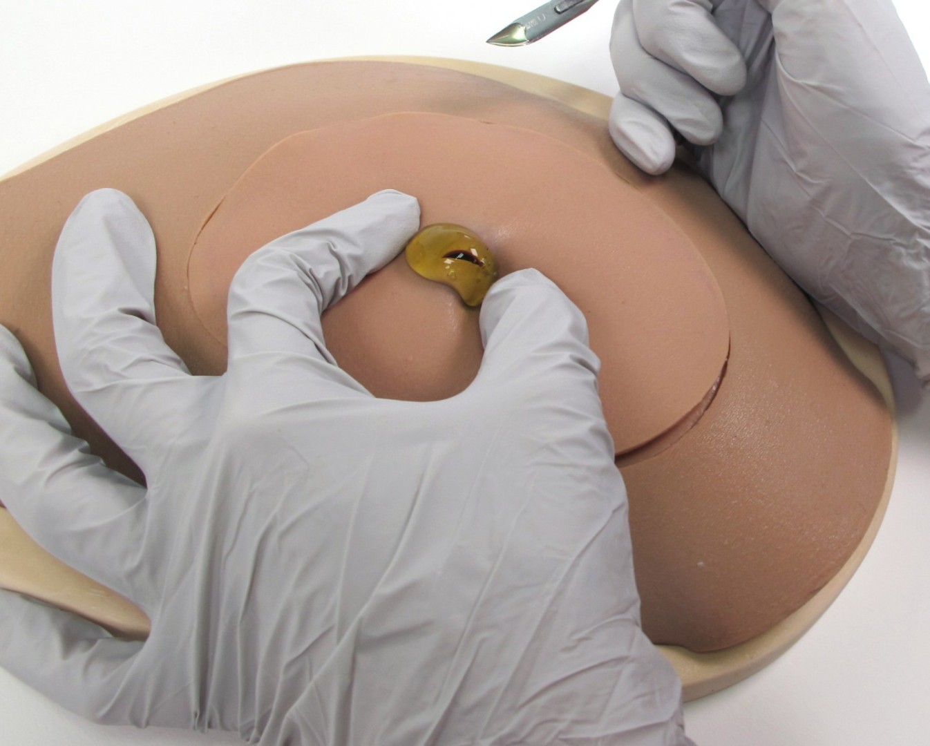 - тренажер позволяет выполнять вскрытие абсцесса с использованием реальных хирургических инструментов