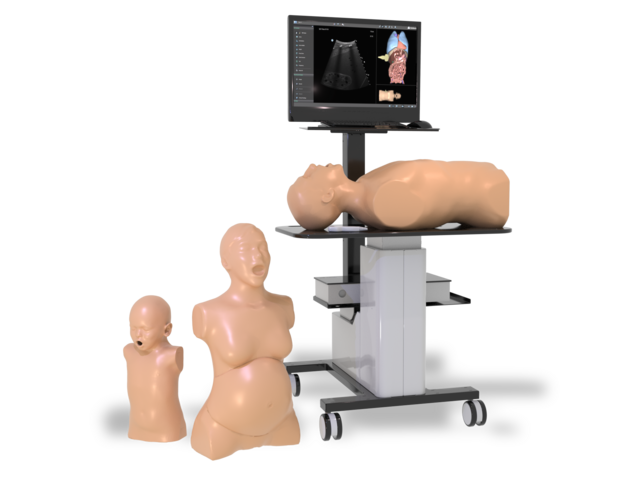 - Манекен мужского пола работает с модулями трансторакальной Эхо-КГ, трансабдоминальным и чреспищеводной Эхо-КГ; манекен женского пола работает с модулями «УЗД в акушерстве и гинекологии», «УЗД во 2-м триместре беременности» (необходимо использование дополнительной накладки на брюшную полость); манекен ребенка для модулей УЗИ брюшной полости, eFAST, прикроватное эхо, расширенное эхо и УЗИ лёгких.