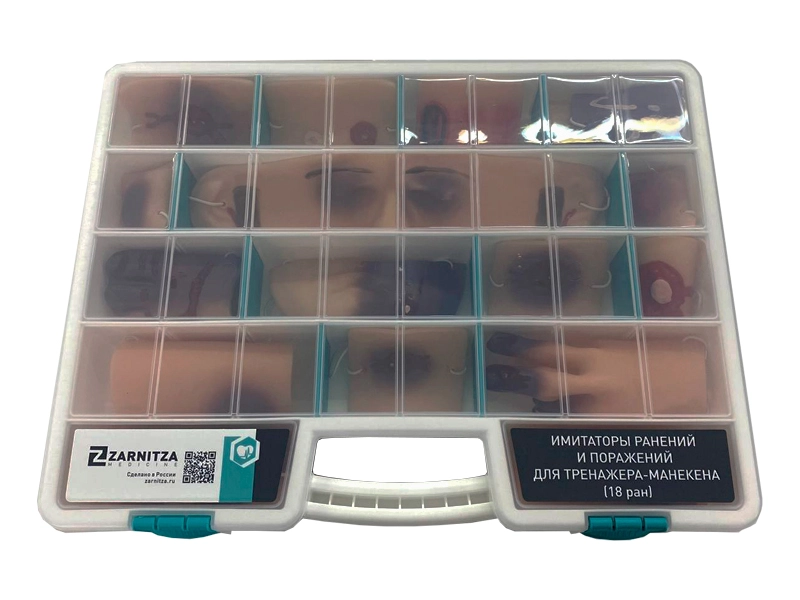 Комплект разработан с учетом анатомических особенностей и позволяет моделировать различные повреждения, включая кровотечения, переломы, ожоги и другие травмы. Материал изготовления обеспечивает реалистичность и долговечность имитаторов травм.