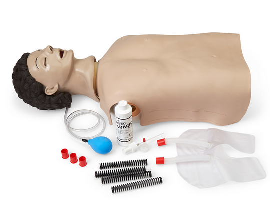 Тренажер для обеспечения проходимости дыхательных путей имитирует пациента без анестезии, для отработки навыков интубации, вентиляции, аспирации и СЛР. Реалистичная анатомия и ориентиры включают зубы, язык, рото- и носоглотку, гортань, надгортанник, черпаловидные хрящи, ложные и истинные голосовые связки, трахею, легкие, пищевод и желудок. Тренажер дает возможность отработать навыки проведения оральной, дигитальной и назальной интубации, а также введения эндотрахеальной трубки (E. T.), пищеводного обтуратора (E. O. A.), фаринготрахеальной трубки (P. T. L.), ларингеальной маски (L. M. A.), пищеводно-желудочного зонда-обтуратора (E. G. T. A.) и трубки Combitube®. Позволяет проводить выдвижение нижней челюсти. Также можно проводить и оценивать методику аспирации и правильное раздувание манжеты. Отличается долговечной, прочной, цельной конструкцией и разветвленной системой легких. Голова манекена взрослого — небольшого размера, что дает возможность отрабатывать более сложные клинические ситуации. Можно проводить СЛР и обеспечение проходимости дыхательных путей. Голова прикреплена к туловищу CPARLENE® Basic Torso. Пальпируемый пульс на сонной артерии. Поставляется со смазкой в пульверизаторе и одноразовыми нижними дыхательными путями для манекена. Футляр для переноски в комплект не входит.