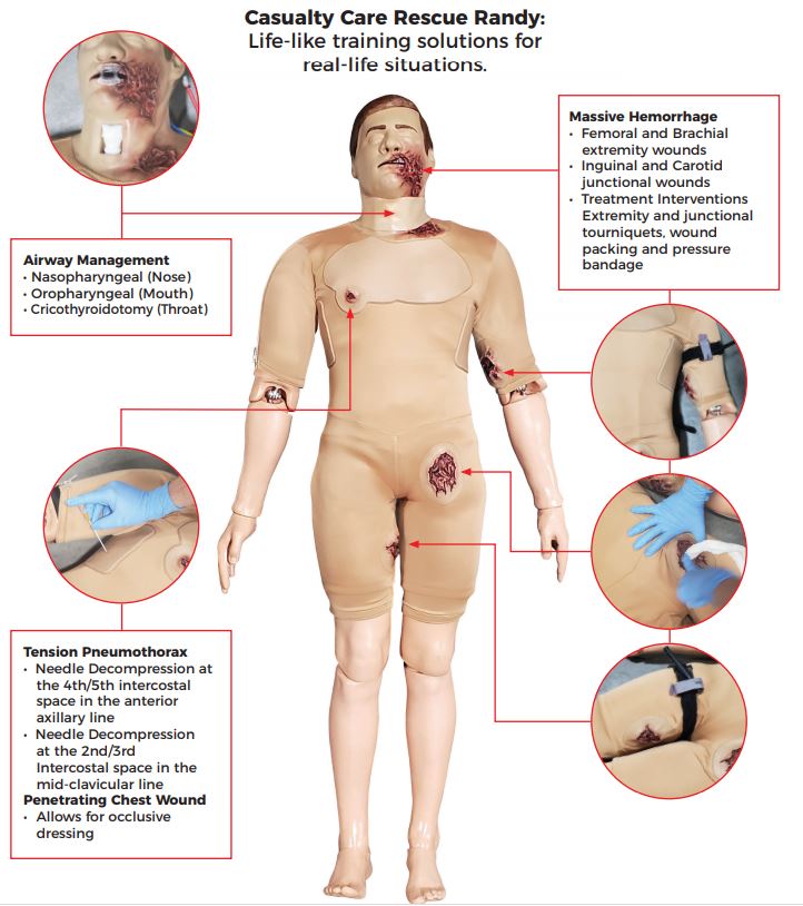 Манекен в полный рост, специально предназначенный для комплексного реалистичного обучения процедурам в случае трех предотвратимых причин смертей: обильное кровотечение, напряженный пневмоторакс, обструкция дыхательных путей. Подходит для обучения оказания тактической медицинской помощи на поле боя и в гражданских условиях.