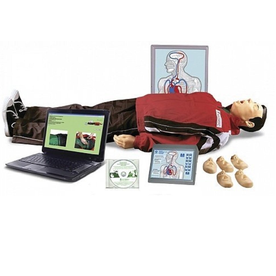 Тренажёр работает совместно с компьютером при помощи интерактивной анимационной обучающей программы с индикацией выполнения всех действий, и цифровым измерением скорости и объема вдуваемого воздуха. Интерактивная анимационная программа «Максим» позволяет проводить индивидуальное и групповое обучение приемам СЛР, сохранять индивидуальные результаты тестов в памяти компьютера и распечатывать их. Подключение пульта контроля – управления к компьютеру осуществляется с помощью USB кабеля или через радиоканал Bluetooth (радиус действия беспроводной Bluetooth – связи не менее 30м., по прямой, без препятствий). На настенном демонстрационном табло изображён торс человека со световой индикацией, как на пульте контроля – управления, отображающей действия по реанимации пострадавшего.
