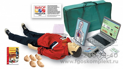 Тренажер для приёмов сердечно-легочной и мозговой реанимации Т28К «Максим В/Р» – предназначен для обучения и отработки навыков оказания первой помощи (экстренной доврачебной помощи), с использованием пульта контроля-управления и обучающей компьютерной интерактивной анимационной программы (ИАКП) «Максим». Тренажер универсальный, позволяет выполнять реанимационные действия для взрослого и ребенка. Тренажёр работает совместно с компьютером при помощи обучающей компьютерной интерактивной анимационной программы с индикацией и оценкой выполнения каждого действия обучаемого, цифровым измерением скорости и объёма вдуваемого воздуха при ИВЛ. Интерактивная анимационная компьютерная программа «Максим» позволяет проводить измерения скорости и объёма воздуха при ИВЛ с помощью цифрового датчика, с выводом результатов на демонстрационный экран и монитор компьютера; индивидуальное и групповое обучение приемам СЛР в учебном и 4-х тестовых режимах. Сохранять результаты тестов в памяти компьютера и распечатывать их. Подключение пульта контроля-управления к компьютеру осуществляется с помощью USB кабеля. Тренажёр может работать без компьютера, индикация действий и управление происходит на пульте контроля-управления и дублируется на настенном демонстрационном табло. Тренажёр оснащён электронным пультом контроля-управления со световой индикацией и настенным демонстрационным табло. С помощью пульта контроля-управления выбирается режим работы, определяется положение запрокидывания головы, состояние поясного ремня, достаточность вдуваемого воздуха при ИВЛ, усилие компрессии при НМС, наличие пульса, положение рук при НМС и правильность проведения реанимации одним или двумя спасателями. Тренажёр работает в учебном и четырех тестовых режимах в двух возрастных категориях взрослый и ребенок: - учебный режим используется для отработки отдельных элементов реанимации; - тестовые режимы: - реанимации одним спасателем (2:15); - реанимации двумя спасателями (1:5). Режимы, рекомендованные Европейским советом по реанимации (ERC): - режим реанимации (2:30); - режим реанимации (30:2) «Учебный режим» сопровождается звуковыми подсказками, текстовыми комментариями и анимационным изображением. После правильного проведения комплекса реанимации в тестовых режимах тренажер автоматически «оживает»: появляется пульс на сонной артерии, сужаются зрачки пострадавшего. Характеристики тренажёра: -манекен человека (1700х550х250 мм, вес 11,6 кг) с верхними и нижними подвижными конечностями; -откидывающаяся назад голова с датчиком правильного угла отклонения; -имитация мягкой кожи головы, лица и шеи, поддающиеся воздействию дезинфицирующих растворов; - анатомическая имитация век, полости рта: верхняя и нижняя челюсть с зубами, язык, нёбо, гортань, верхняя часть трахеи, нос с ноздрями и мягкими крыльями для сжатия в режиме «изо рта в рот»; -анатомические ориентиры грудной клетки; -имитация «пульса» на сонной артерии; -имитация «сужения зрачков» при правильно выполненной ИВЛ и «оживлении тренажера»; - цифровой датчик измерения скорости и объёма потока воздуха при ИВЛ в двух возрастных категориях взрослый и ребенок - сменные лицевые дезинфицируюемые маски – 5шт.; - имитация расстёгивания поясного ремня для предотвращения нанесения ущерба внутренним органам; - датчики 