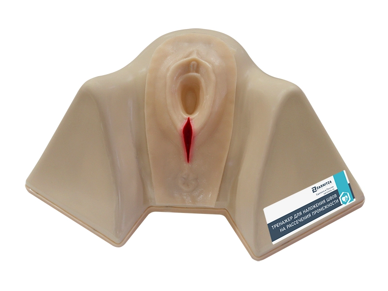 Тренажер предназначен для обучения навыкам наложения швов при разрывах и рассечениях промежности, которые являются наиболее частыми проявлениями патологий в акушерской практике. Материал наружных половых органов визуально и пальпаторно имитирует кожу человека.