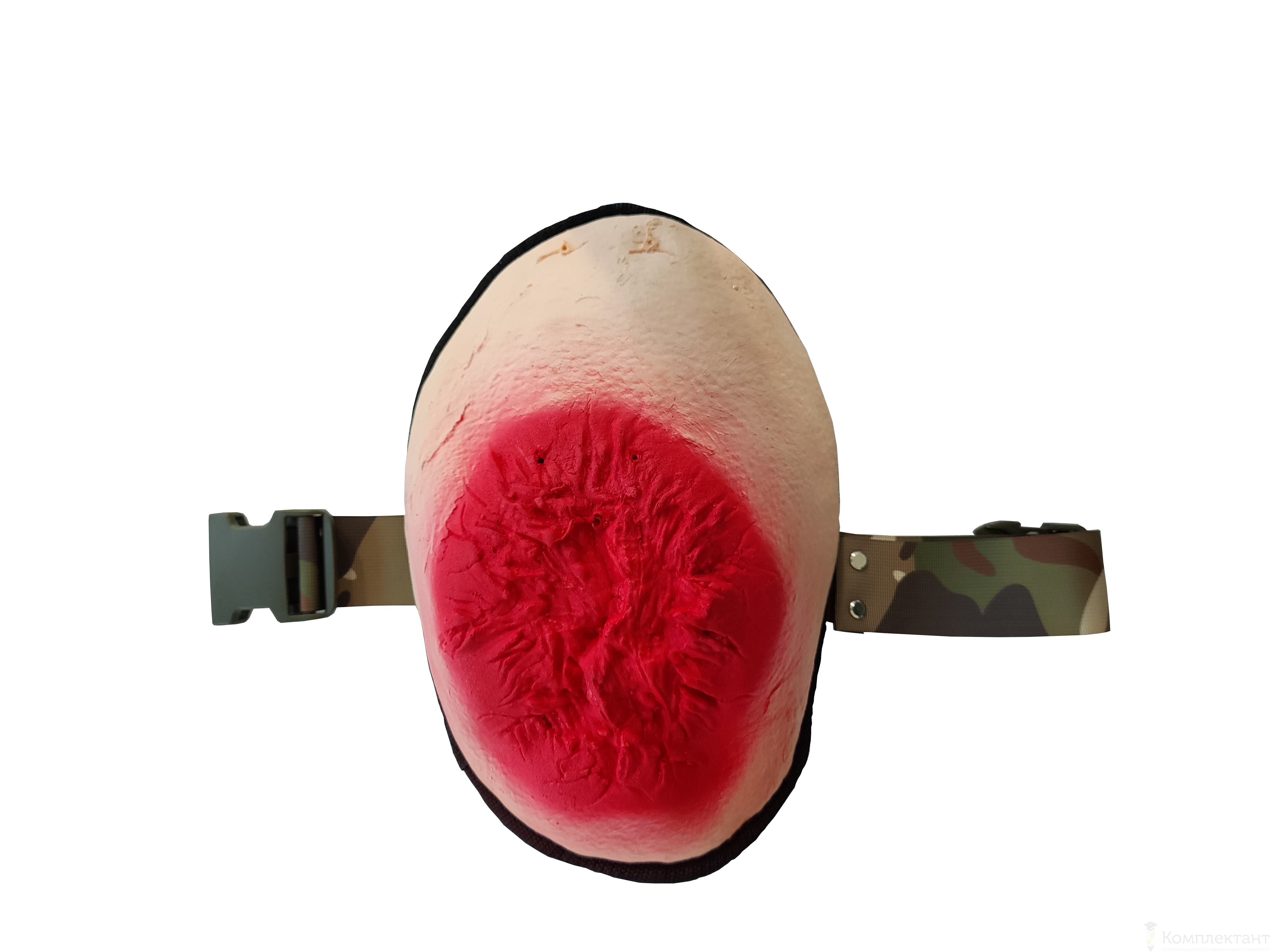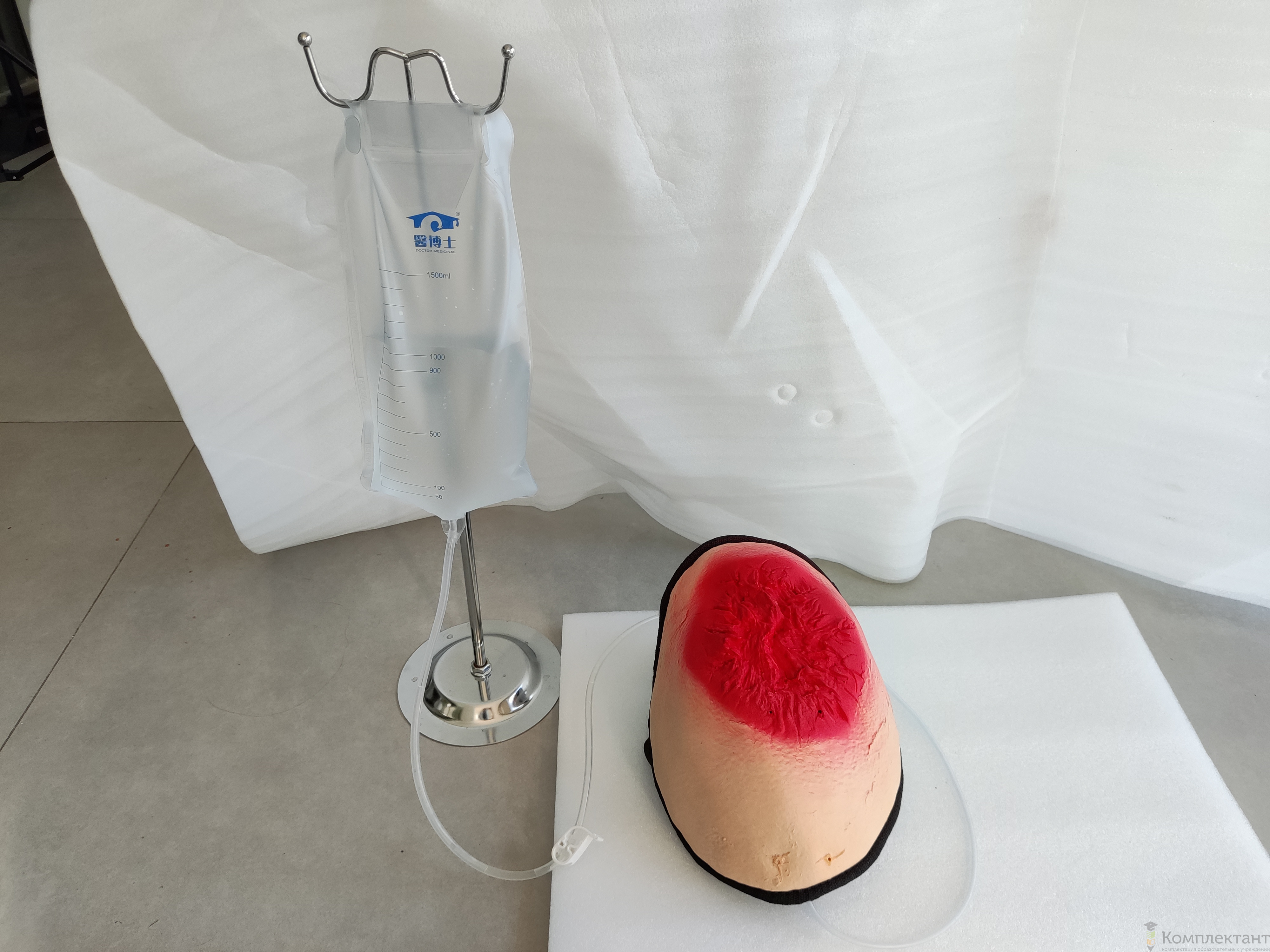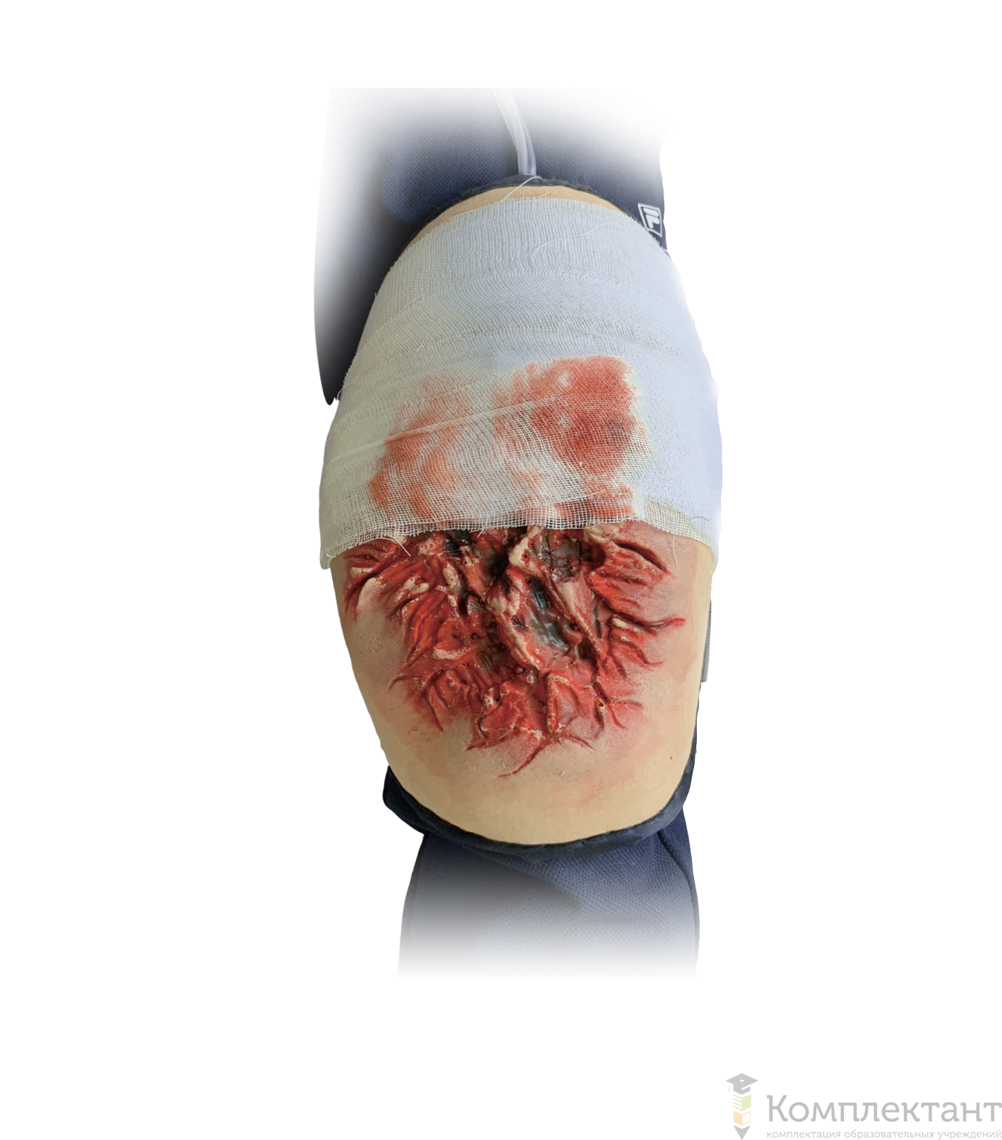 Тренажер имитирует взрывную травму бедра и артериальное кровотечение.